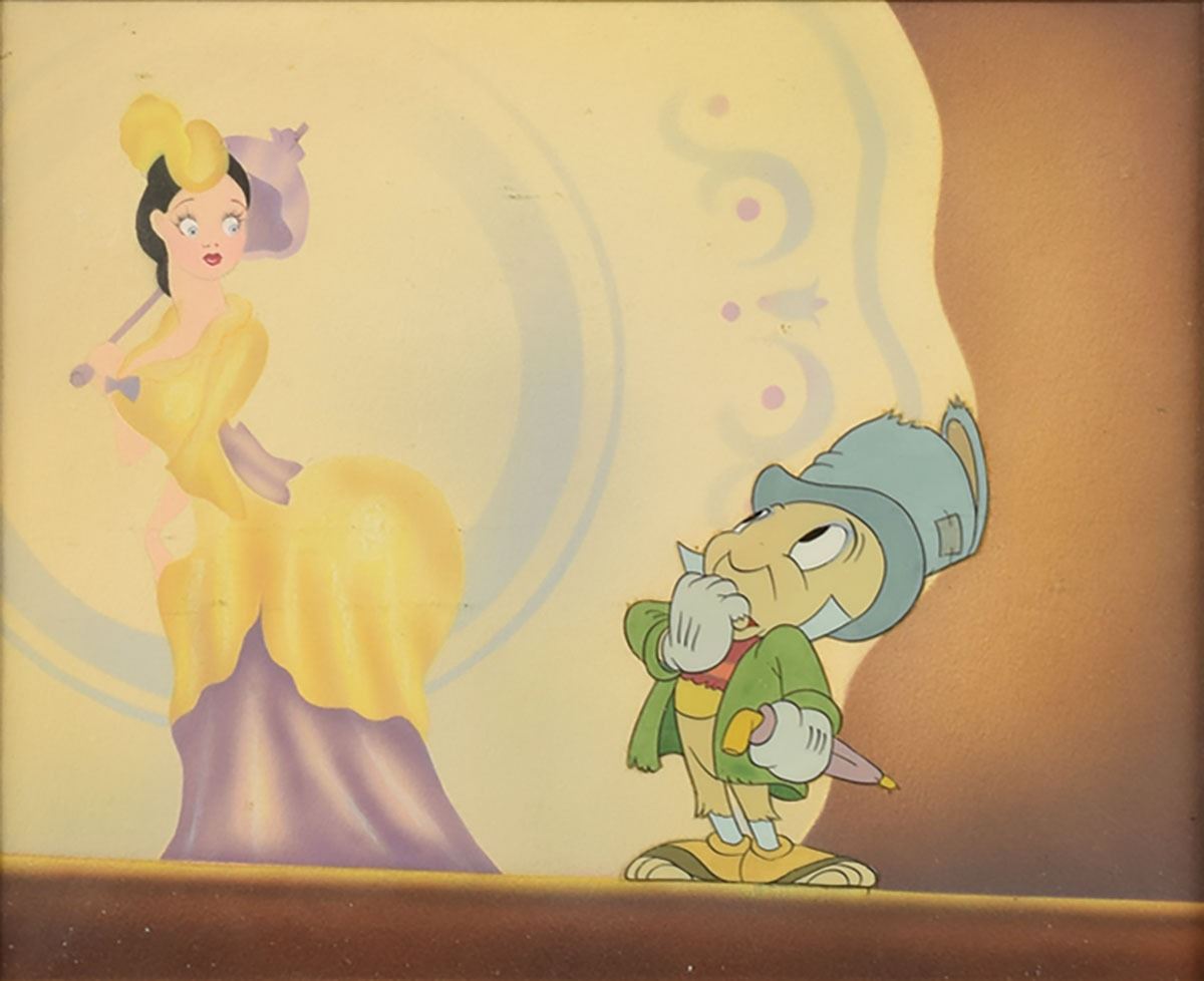 (Walt Disney Studios, 1940) Original production cel featuring Jiminy Cricket from Pinocchio, showing him dressed as the tramp from early in the film, humorously looking up at a woman's rotund bottom. The cel has been trimmed and applied to a hand-painted background as prepared by Courvoisier Galleries for sale. Image measures 2.25 x 3.25, with a mat opening of 7.75 x 6.25. Matted to an overall size of 15 x 13.5. In fine condition.