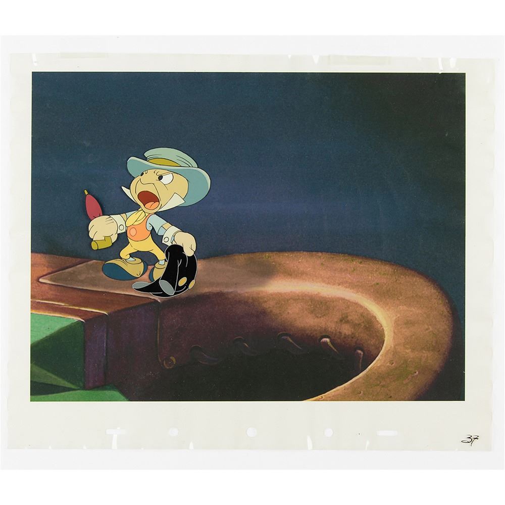 (Walt Disney Studios, 1940) Original full 12-field production cel of Jiminy Cricket from Pinocchio, depicting the good-hearted bug holding his umbrella and coat in an unusually upset full-length pose. The cel, which is marked "37" in the lower right corner, is placed on a giclee background from the same film. Image measures 3.25 x 3.75, with overall dimensions of 12.75 x 10.75. In fine condition.