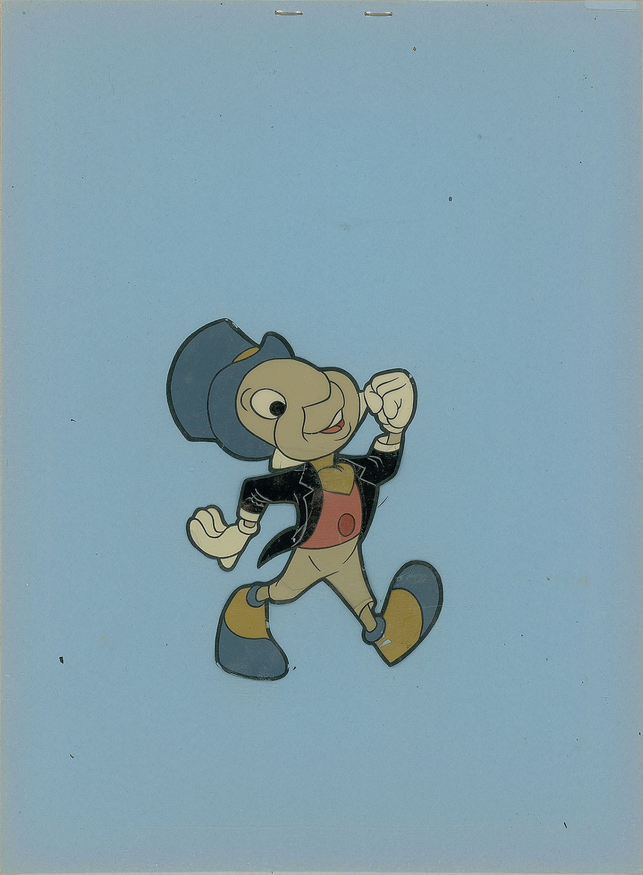 (Walt Disney Studios, 1950s) Original production cel featuring Jiminy Cricket from a Disney cartoon, showing him happily strolling along. Image measures 3 x 4.25, with overall dimensions of 7.5 x 10. Reverse of the backing bears a gold label stating that this is an original hand-painted celluloid actually used in a Walt Disney production, and was released exclusively by the Art Corner at Disneyland. In very good to fine condition, with some cracking and lifting to paint, which has become partially transferred to the backing material.
