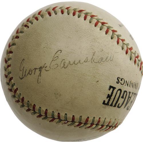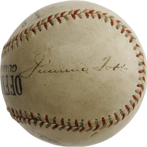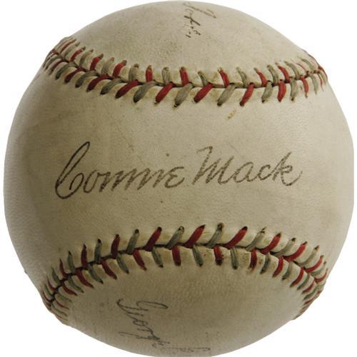 <B>Circa 1929 Jimmie Foxx & Connie Mack Signed Baseball.</B></I> The Tall Tactician's second great dynasty is remembered with this "Official League" ball bearing the superb signatures of Connie Mack, Jimmie Foxx and George Earnshaw. Mack's sweet spot autograph rates a magnificent 9.5/10, with superstar slugger Foxx just a step behind at 8/10 on the panel above. Just below Mack is Earnshaw's 8/10 signature. As our catalog imagery will reveal, each autographs presents beautifully as a single, offering the look of a ball that would easily bring five figures in the present market. Likewise, the Foxx and Mack could be displayed concurrently, leaving the less desirable Earnshaw hidden from view. <I>LOA from PSA/DNA.</B></I> <BR><BR><B>Important notice:</B> Heritage usually auctions material at the rate of 200-250 lots per hour. On some occasions eBay Live bid software or the Internet may not be able to keep up with the pace of the auction. We recommend placing a realistic absentee bid now as insurance to avoid disappointment. Occasionally the auctioneer may eliminate or reject an eBay Live bid, and the auctioneer may also reopen a lot after the close of the eBay live bidding (usually because we missed an audience bid), and may reject your bid even if it shows you as the winning bidder. By bidding via eBay Live, you agree that Heritage may award the lot to another bidder at its sole discretion under the circumstances described above or any other reasonable circumstances. Since eBay bids are not shown to us until we open the lot on the floor, we treat those bids just like floor bids. In most cases the floor responds before the eBay bid is presented to us, due to Internet lag time, so for consistency we have made it a policy that floor bids are always considered first over tie eBay live bids. Also please note that all Heritage lots purchased through eBay Live carry a 22.5% Buyer's Premium. Please make sure you read the Terms and Conditions before you bid. This lot is being auctioned in conjunction with a live floor auction by Heritage Galleries & Auctioneers. All final auction and invoice information will be supplied by Heritage Galleries & Auctioneers, and all other information should be considered preliminary. Lot:19004 <BR><BR><B>Winning Notification and Billing:</B> After the FINAL session in this auction is complete, Heritage will send e-mail and snail mail invoices. This process normally takes several days. All final auction and invoice information will be supplied by Heritage Galleries & Auctioneers, and all other information should be considered preliminary. <BR><BR>This auction will be conducted on a live auction floor and over the Internet through eBay Live. If you choose to place an absentee bid, please take a moment to <font color='#0000ff'><u><a href='http://pages.ebay.com/liveauctions/help/before/laabsentee.html'>learn how eBay Live absentee bidding works</a></u></font><font color='#000000'>