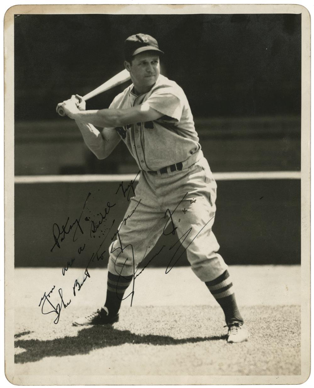 Vintage matte-finish George Burke photo of Jimmie Foxx at bat in a Boston Red Sox road jersey, signed and inscribed in fountain pen, ''Patsy, You are a swell guy / The best to you / Jimmie Foxx.'' 8'' x 10'' black and white photo is in very good condition, with small corner creases, a few stray ink marks, brush to the word ''best'' and silvering to the darker areas. The image bears rounded corners, as issued by Burke. Larger signed images of the Hall of Famer -- particularly those taken by a noted sports photographer such as Burke -- are virtually nonexistent. Accompanied by PSA/DNA COA.