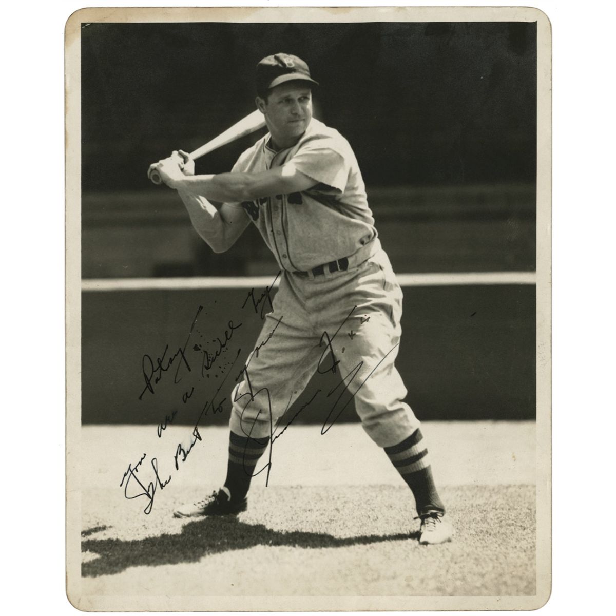 Vintage matte-finish George Burke photo of Jimmie Foxx at bat in a Boston Red Sox road jersey, signed and inscribed in fountain pen, ''Patsy, You are a swell guy / The best to you / Jimmie Foxx.'' 8'' x 10'' black and white photo is in very good condition, with small corner creases, a few stray ink marks, brush to the word ''best'' and silvering to the darker areas. The image bears rounded corners, as issued by Burke. Larger signed images of the Hall of Famer -- particularly those taken by a noted sports photographer such as Burke -- are virtually nonexistent. Accompanied by PSA/DNA COA.