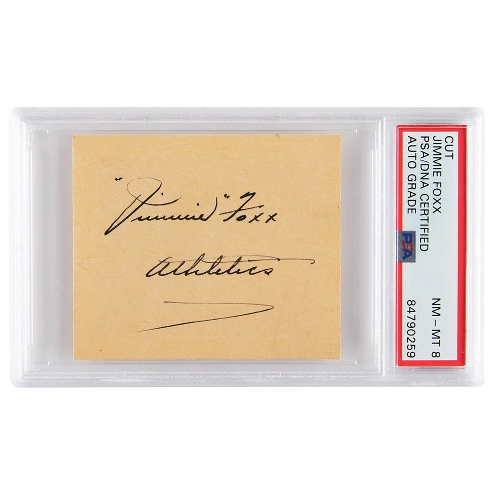 Vintage ink signature, "& #39;Jimmie& #39; Foxx, Athletics,& rdquo; on an off-white 3 x 2.5 sheet. In fine condition, with old mounting residue on the back. Encapsulated and graded by PSA/DNA as "NM-MT 8."
