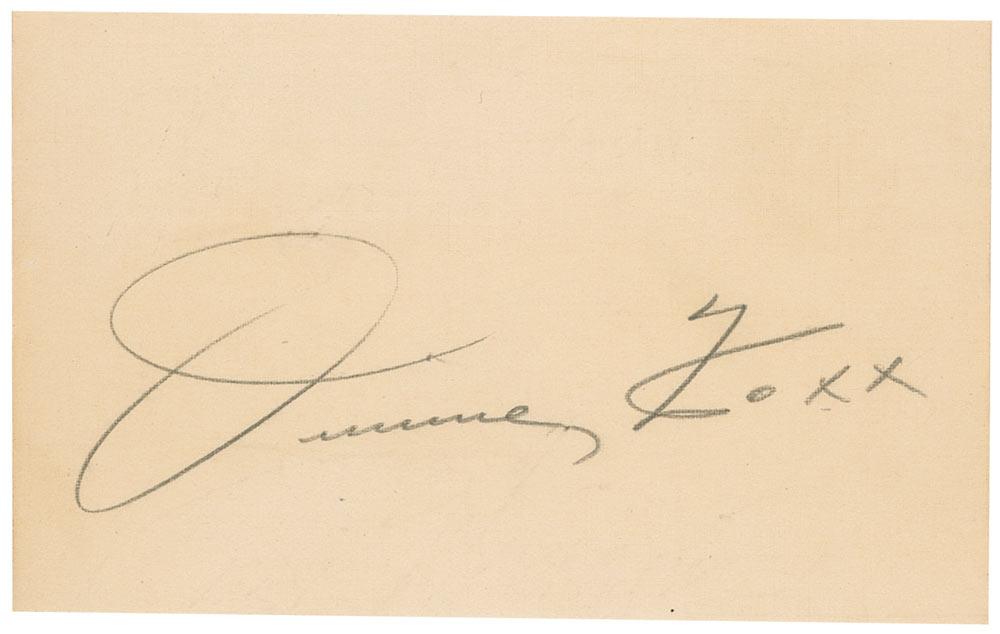 Baseball Hall of Famer (1907–1967) who became the second major league player to hit 500 career home runs after Babe Ruth. Vintage pencil signature, “Jimmie Foxx,” on an off-white 4.25 x 2.75 slip. In fine condition, with some scattered mild toning.