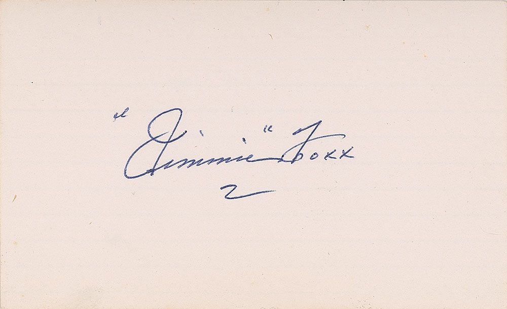 Superlative ballpoint signature, “‘Jimmie’ Foxx,” on an off-white 5 x 3 card. In fine condition.