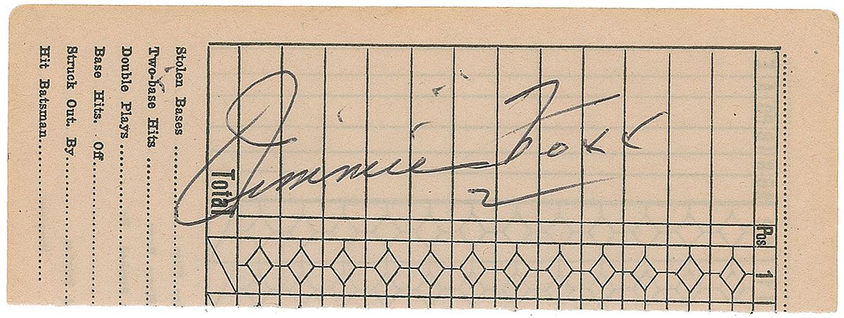 Ballpoint signature, “Jimmie Foxx,” on an off-white 5.25 x 2 slip clipped from a baseball scorebook. In fine condition.