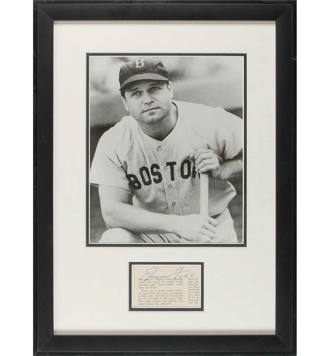 Ballpoint signature, “Jimmie Foxx,” on an off-white 3.25 x 2 slip clipped from an article about baseball. Nicely archivally double-matted and framed with a photo of Foxx to an overall size of 12.75 x 17.25. In fine condition.