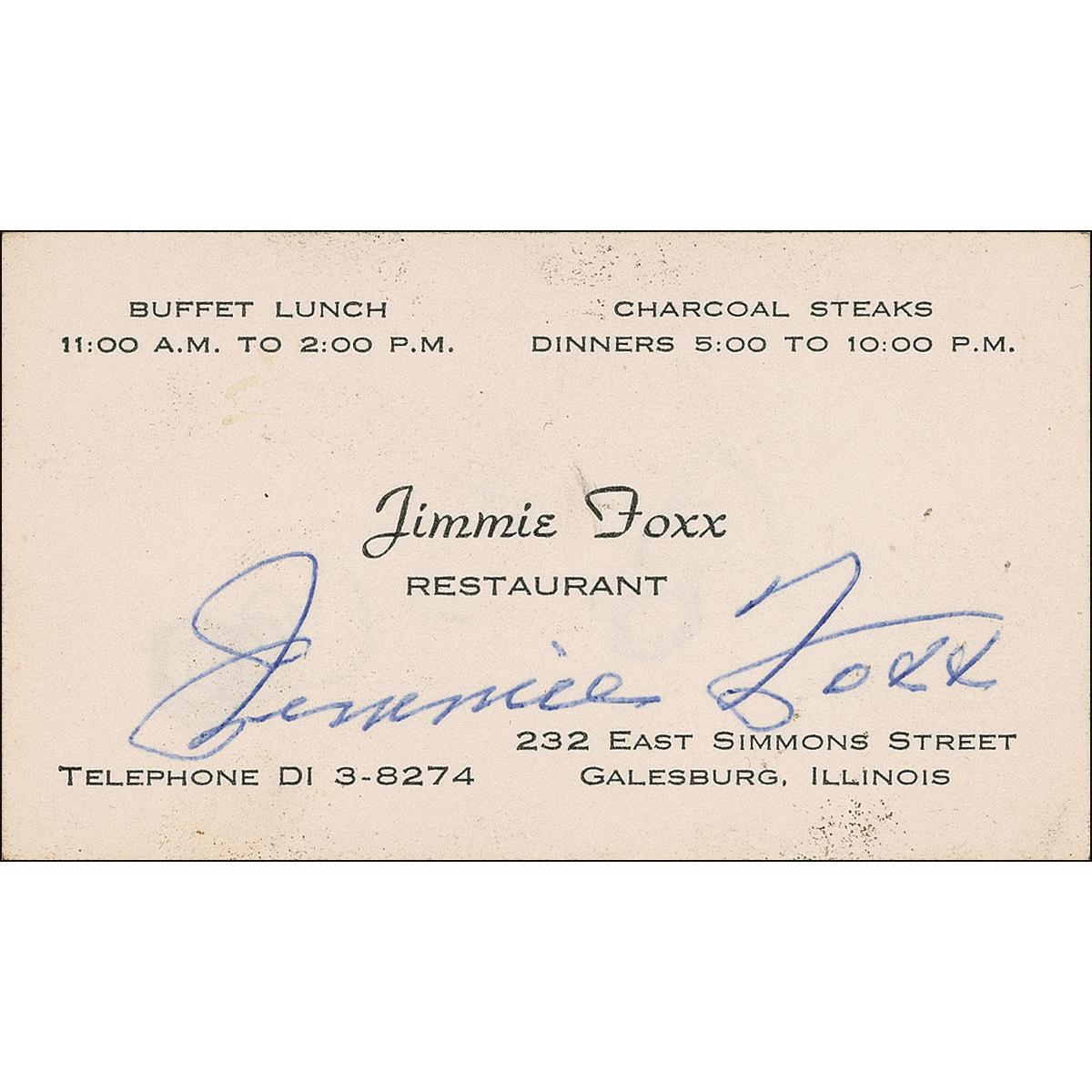 A fearsome power hitter whose strength earned him the moniker ‘The Beast,’ Foxx was the anchor of an intimidating Philadelphia Athletics lineup that produced pennant winners from 1929 to 1931. Jimmie Foxx Restaurant business card, 3.5 x 2, for his restaurant in Galesburg, Illinois, signed on the front in blue ballpoint, “Jimmie Foxx.” In fine condition, with some scattered light soiling. Foxx made his home in Galesburg for a time in the 1960s and owned a restaurant there that bore his name, reportedly spending most of his time in the bar.