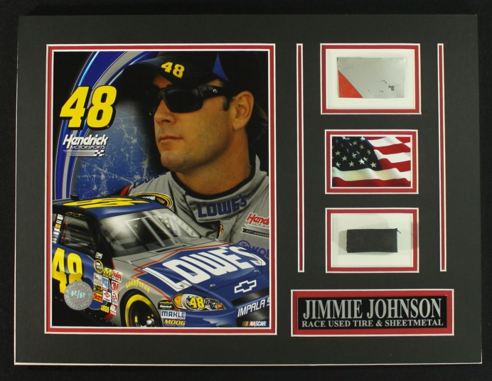 This piece measures 16x12 in size and is highlighted by a piece of race-used sheet metal as well as a 2"x1" section of race-used tire from a Jimmie Johnson car. Piece comes with a COA for authenticity purposes.