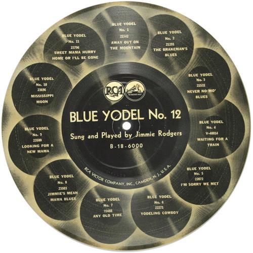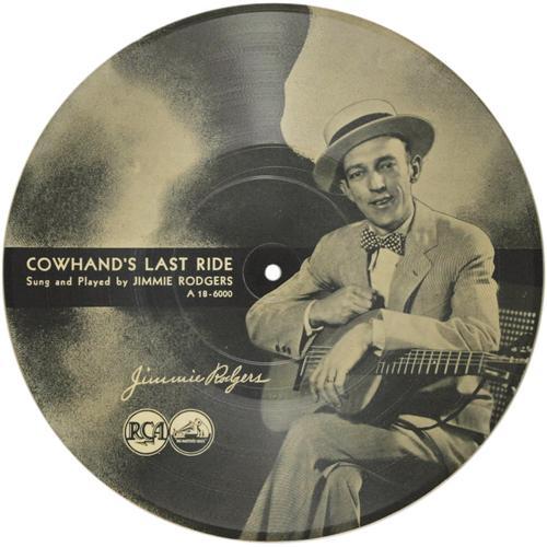 <B>Jimmie Rodgers "Cowhand's Last Ride" Rare 78 Picture Disc (RCA 18-6000, 1933).</B></I> This one from "The Father of Country Music" turned heads all around the office - now it's your turn! If this isn't the first picture disc, what is? One of the real treasures among the records we're offering this time around. The picture vinyl is pulling away from the record core, causing a center warp, more pronounced on the flip side ("Blue Yodel #12"). "Cowhand's Last Ride" plays VG 5.<BR><BR><b>Shipping:</b> Recordings (<a target="_blank" href="http://www.heritageauctions.com/common/shipping.php">view shipping information</a>)