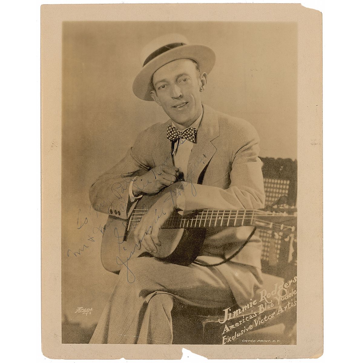Singer-songwriter (1897–1933), known as the ‘Singing Brakeman’ and ‘Yodeling Cowboy.’ In melding jazz, blues, and Southern mountain music, Rodgers became one of the first superstars of country music, and one of the original inductees into the Country Music Hall of Fame in 1961. Diagnosed with tuberculosis in his late twenties, he nonetheless continued to record prolifically and to tour until his death at the age of 35. Uncommon vintage matte-finish 8 x 10 photo, signed and inscribed in fountain pen “To my pals Mr. & Mrs. Charlie Kamakas, Sincerely, Jimmie Rodgers.” In good to very good condition, with a few marginal chips and small creases, chip to bottom margin with tear slightly extending into image, light rubbing under signature, mild soiling, signature a shade light and slightly indistinct against background (though fully vislble). Many of the faults could be matted out for an attractive presentation.