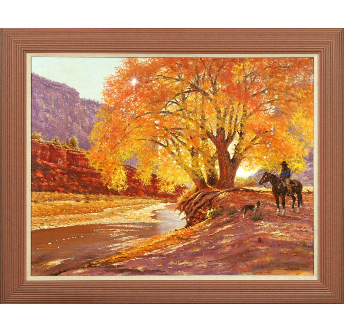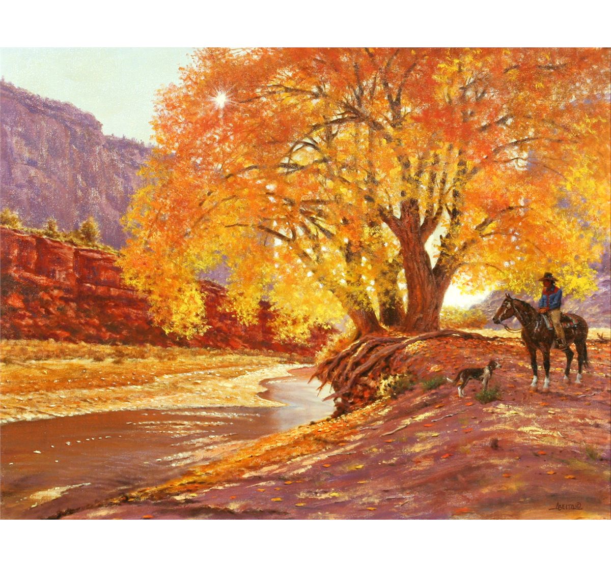 Jimmy Abeita (1947 - ). Resting Under Cottonwood. 24" x 30" oil on canvas. Signed lower right: ABEITA ©.