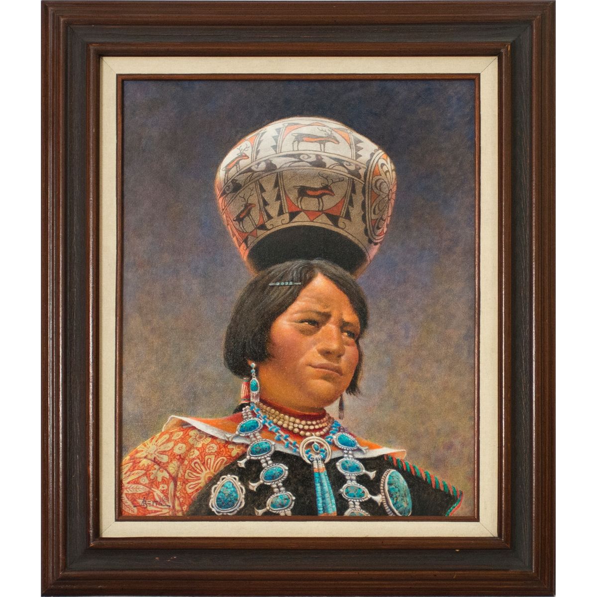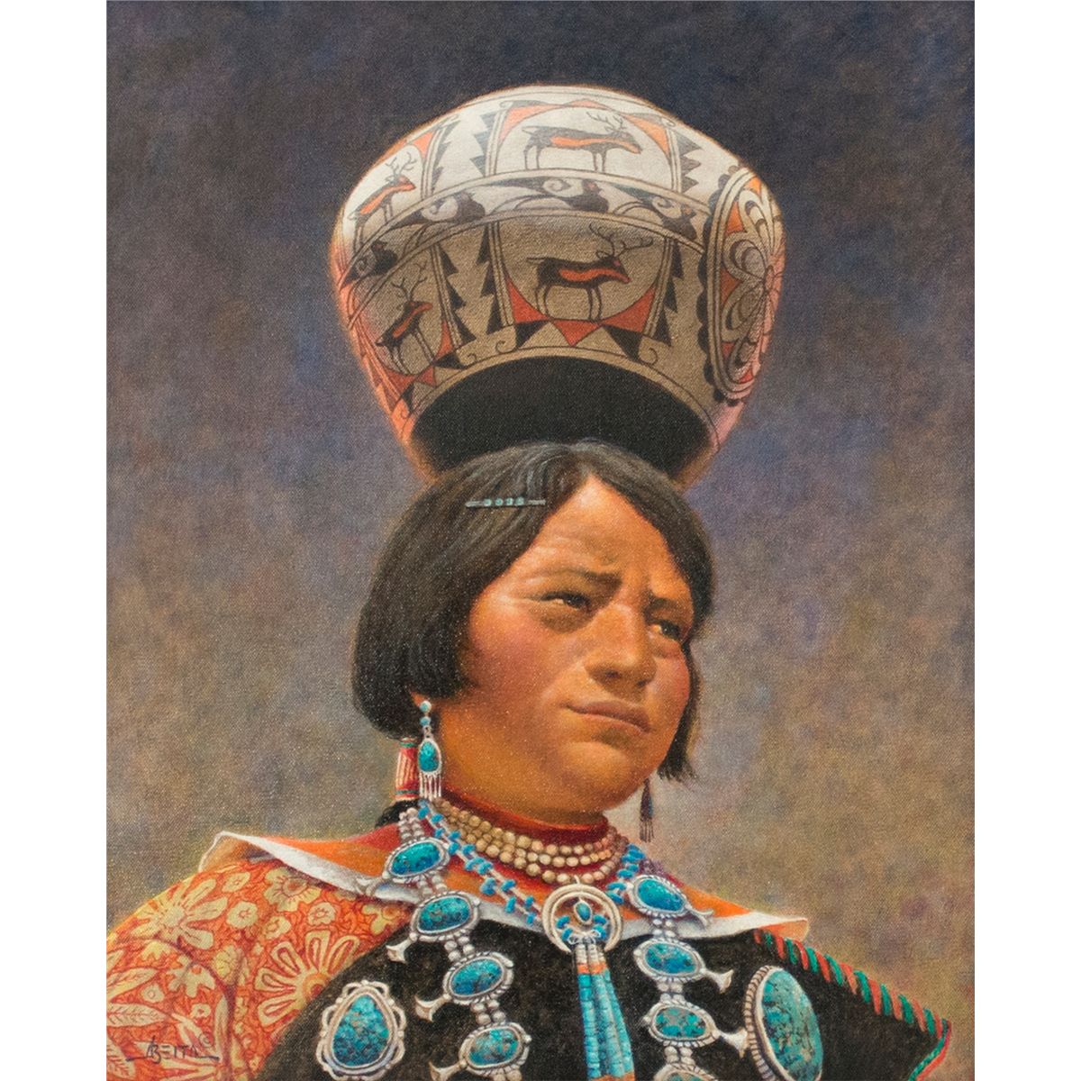 Jimmy Abeita (1947 - ). Olla Maiden. 20" X 16" oil on canvas. Signed lower left: ABEITA ©. Provenance: Indian River Gallery.
