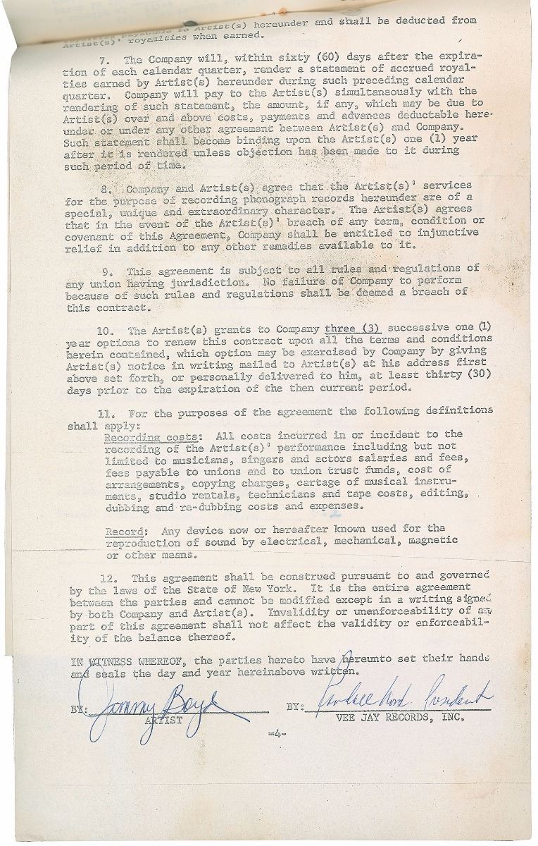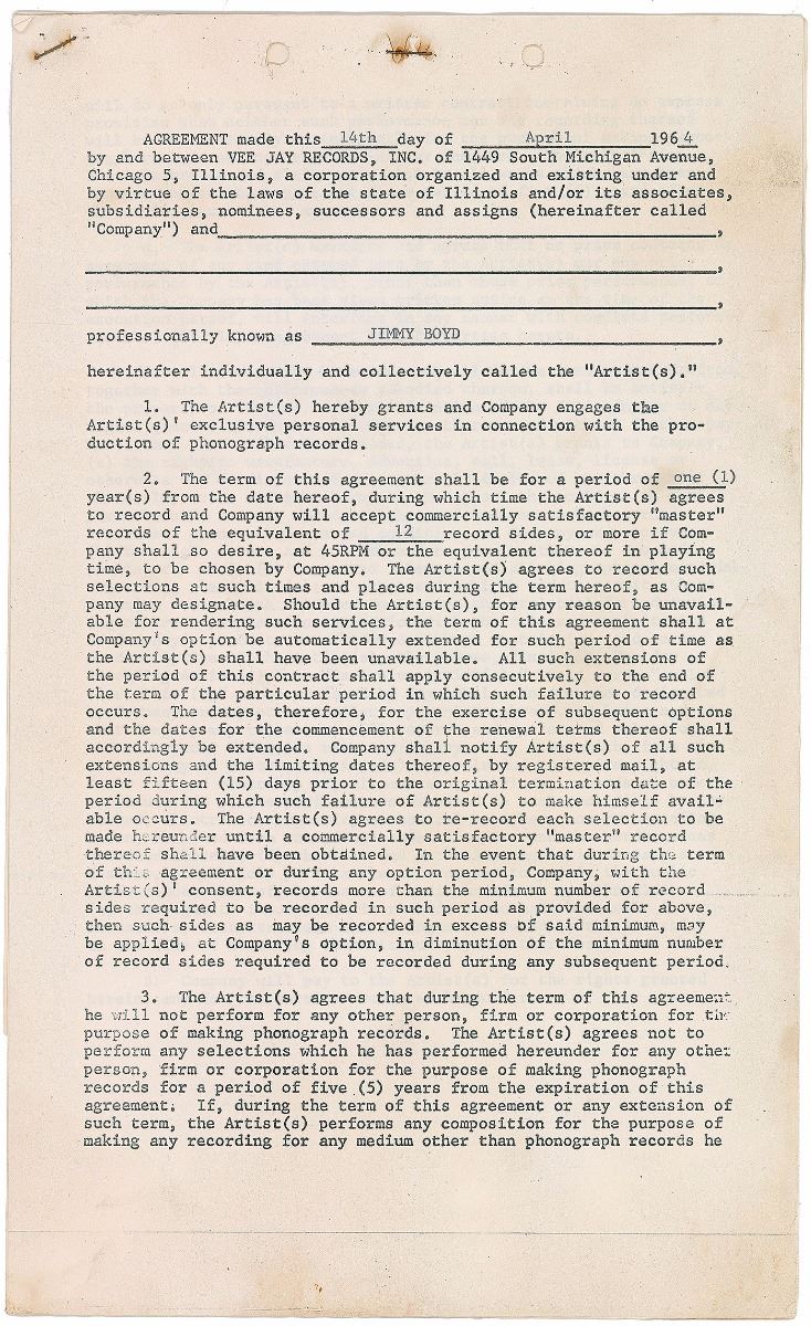American singer, musician, and actor (1939–2009) who is best remembered for his recording of the song ‘I Saw Mommy Kissing Santa Claus.’ Scarce DS, four pages, 8.5 x 14, April 14, 1964. Agreement between Vee Jay Records and Boyd for a period of one year, in which time the latter “agrees to record and Company will accept commercially satisfactory ‘master’ records of the equivalent of 12 record sides, or more…at 45RPM or the equivalent thereof in playing time.” Signed at the conclusion in blue ballpoint by Boyd, and countersigned by a Vee Jay Records representative. Attached is an artists advance sheet for Boyd. In fine condition, with spots of soiling .