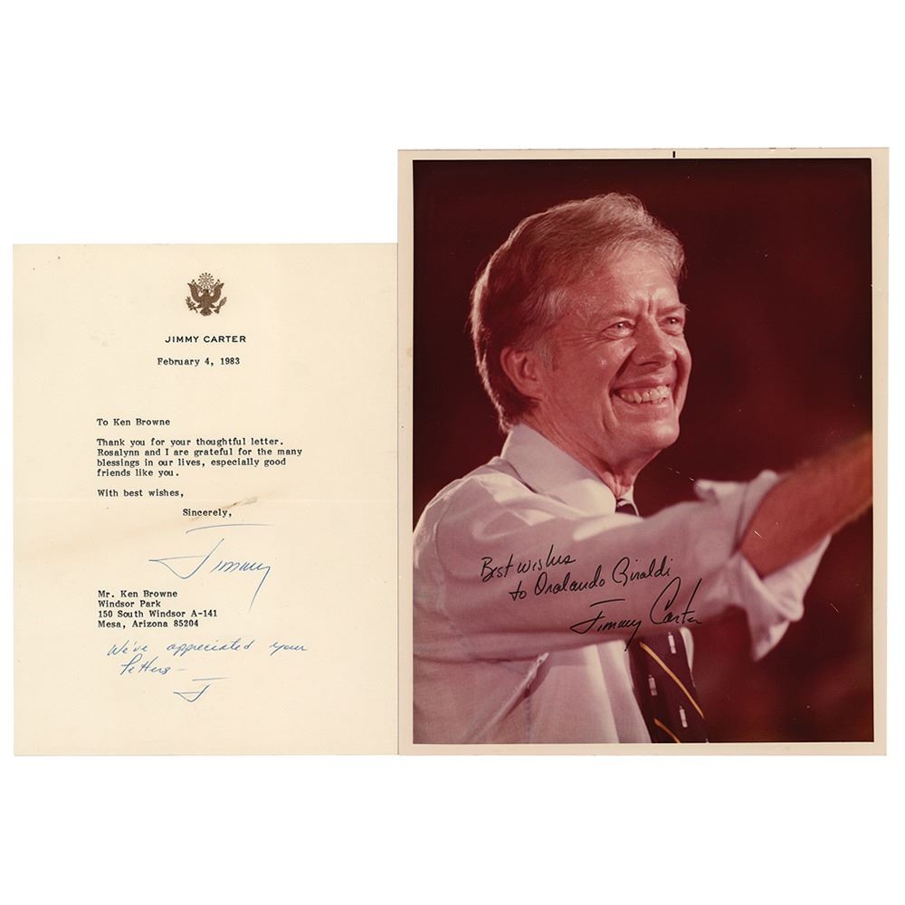 Two items: a TLS, signed “Jimmy,” one page, 6.5 x 8.5, personal letterhead, addressed to Ken Browne, in full: “Thank you for your thoughtful letter. Rosalynn and I are grateful for the many blessings in our lives, especially good friends like you,” with Carter adding in his own hand below: “We’ve appreciated your letters”; and a color satin-finish 8 x 10 photo of Carter flashing a bright smile, signed and inscribed in black felt tip, “Best wishes to Oralando Ziraldi, Jimmy Carter.” The reverse of the photo bears an official White House stamp dated July 31, 1979. In overall very good to fine condition, with light creasing to the photo.