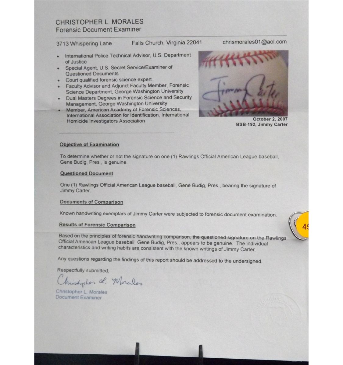 Jimmy Carter Autographed Baseball. Rawlings Official American League Ball. Appraised or estimated retail value $2000. COA by Christopher Morales. All Sales Final. Please see terms and conditions of auction.