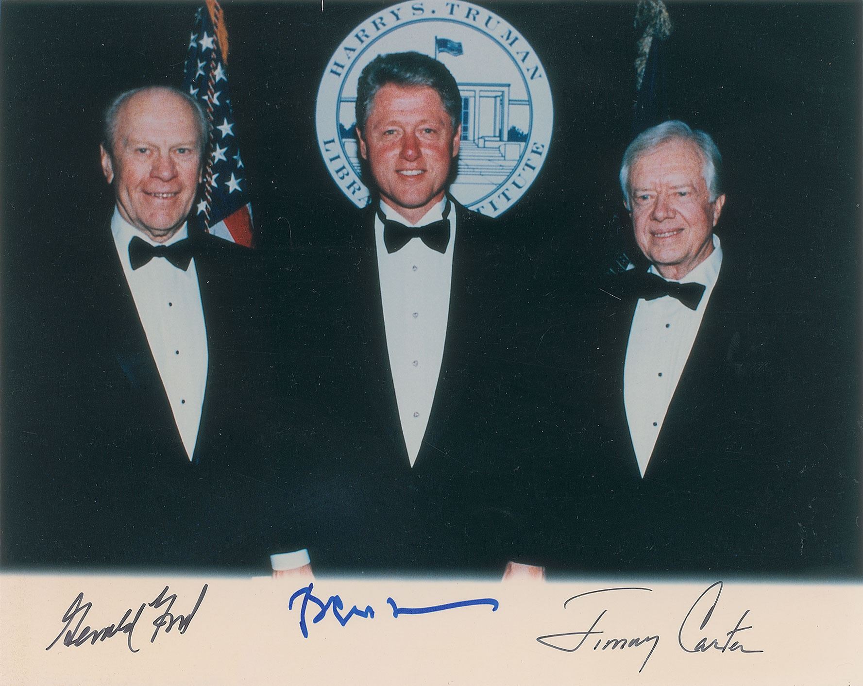 Color satin-finish 10 x 8 photo of former presidents Gerald Ford, Bill Clinton, and Jimmy Carter posing together at an event held at the Harry S. Truman Library Institute, signed in the lower border in black felt tip, "Gerald Ford" and "Jimmy Carter," and in blue felt tip, "B. Clinton." In fine condition. Accompanied by a full letter of authenticity from JSA.
