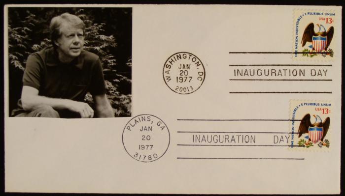 This is a very rare Jimmy Carter double inauguration, postmarked twice on the same cover. This was accomplished by a man flying from Georgia to Washington, and back again. The postmarks are from D.C. and Plains, dated January 20, 1977.