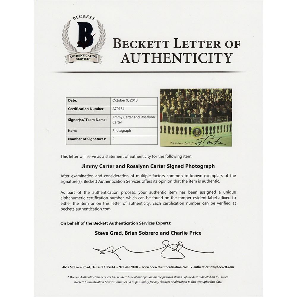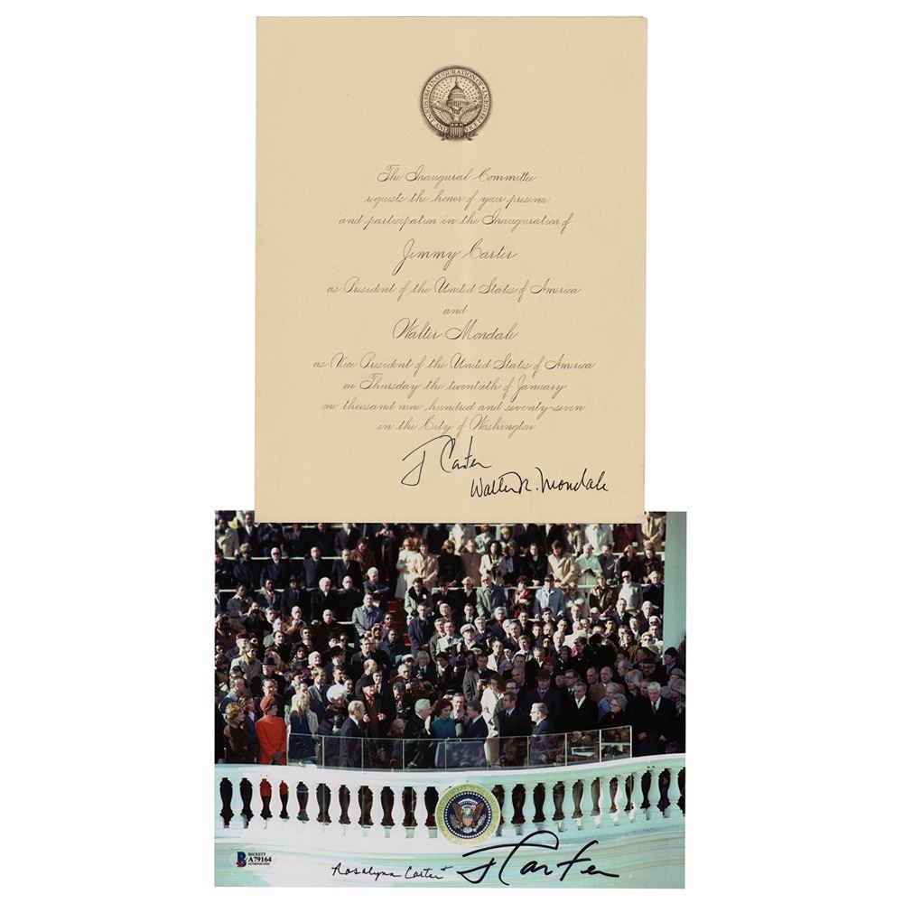 Two items: an attractive official 8.25 x 10.75 invitation to the inauguration of President Jimmy Carter and Vice President Walter Mondale on January 20, 1977, signed at the bottom in black felt tip, "J. Carter" and "Walter F. Mondale"; and a color glossy 10 x 8 photo of Carter being sworn in on the occasion, signed in black felt tip, "J. Carter" and "Rosalynn Carter." In overall fine condition, with a Beckett label affixed to the lower corner of the photo. Accompanied by a full letter of authenticity from Beckett Authentication Services.