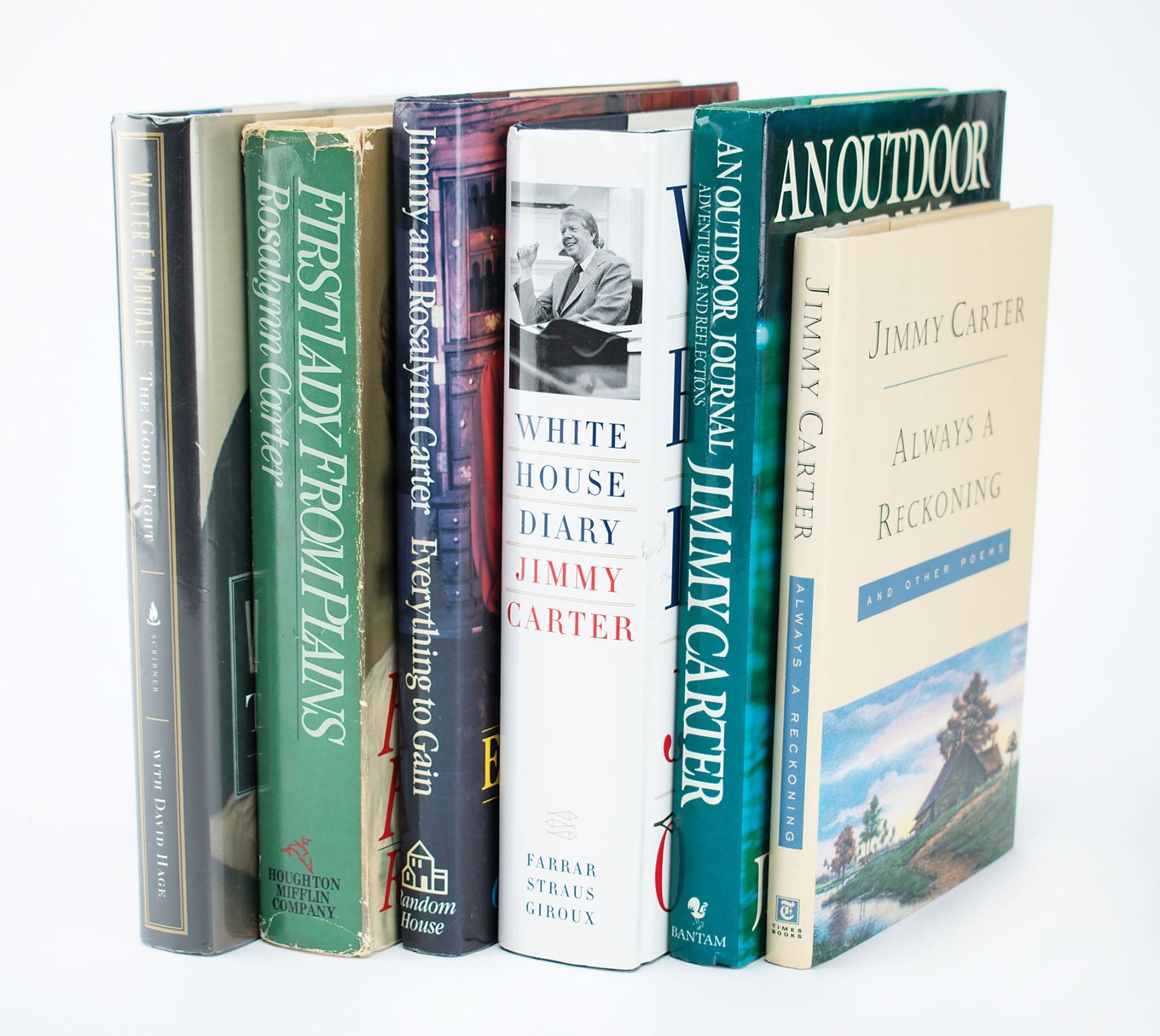 Six signed books, all hardcovers with dust jackets: Everything to Gain, signed on the first free end page in black felt tip by Jimmy Carter and Rosalynn Carter; White House Diary, signed inside in on a bookplate in black felt tip by Jimmy Carter; An Outdoor Journal, signed on the first free end page in black felt tip by Jimmy Carter; Always a Reckoning, signed on the first free end page in black felt tip by Jimmy Carter; First Lady From Plains, signed on the first free end page in black ballpoint by Rosalynn Carter; and The Good Fight, signed and inscribed on a free end page in black felt tip by Walter Mondale. In overall fine condition, with some scuffing to the dust jacket of An Outdoor Journal.