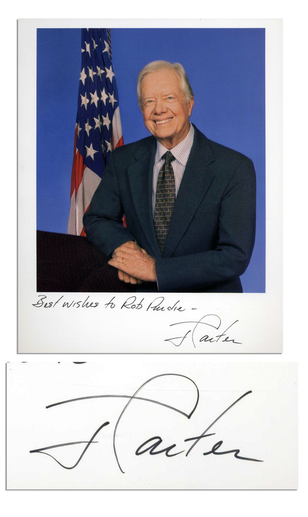 Jimmy Carter signed and inscribed 8'' x 10'' photo. Signed in black ink along the bottom, ''Best wishes to Rob Purdie - J Carter''. Photo is a laser printed card-stock color photo. Near fine condition.