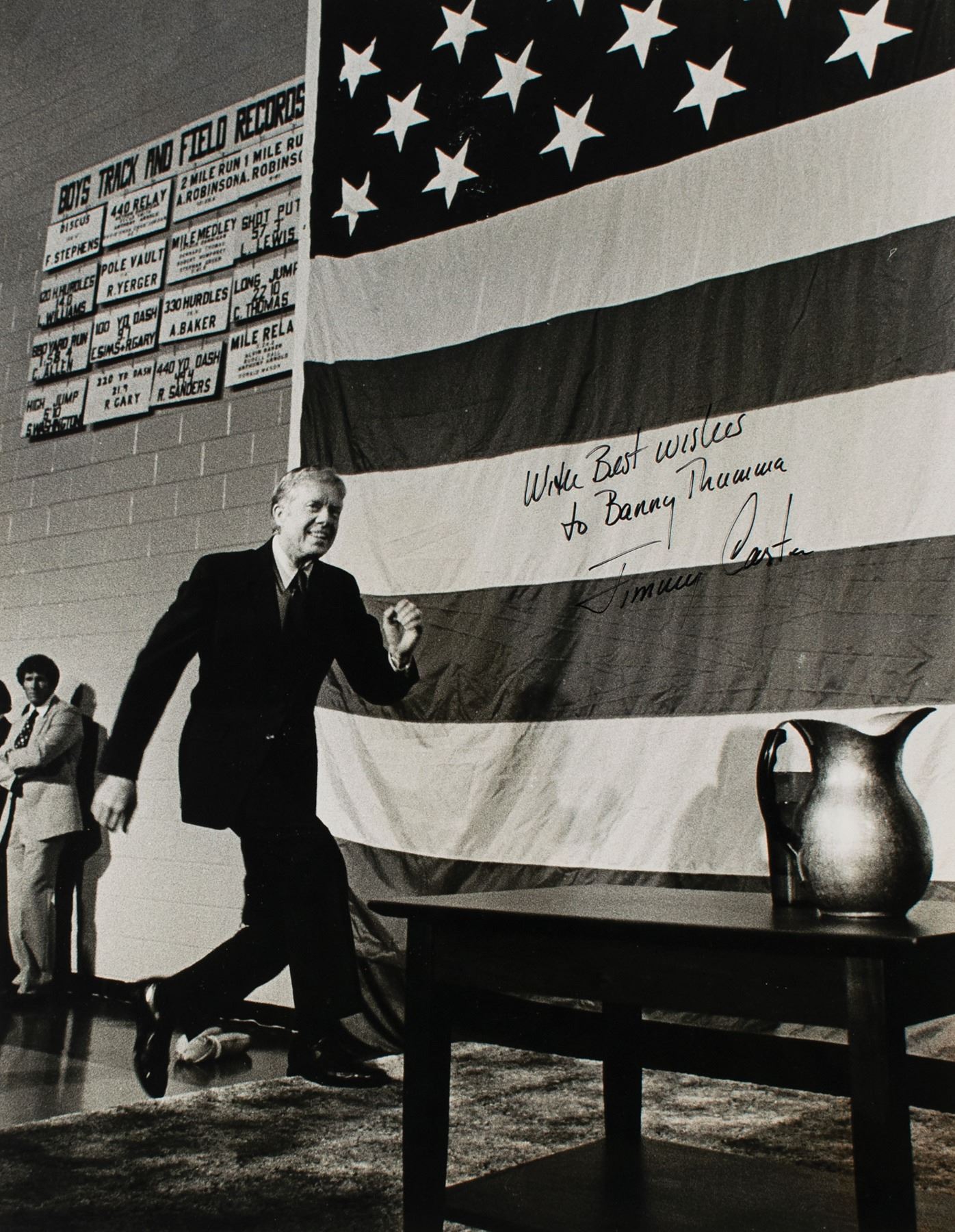 Glossy 11 x 14 photo of Carter energetically taking the stage in front of a huge American flag, signed and inscribed in black felt tip, "With best wishes to Barry Thumma, Jimmy Carter.” Affixed to a same-size mount and in fine condition. Thumma was an Associated Press photographer who covered four presidents (Carter, Reagan, Bush, and Clinton), traveling on Air Force One over 100 times throughout his career.