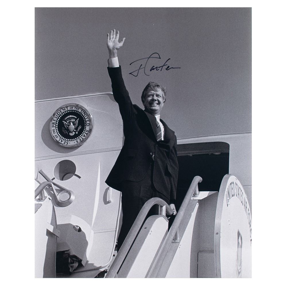 Satin-finish 16 x 20 photo of President Carter waving from the steps of Air Force One, signed in black felt tip, "J. Carter." In fine condition.