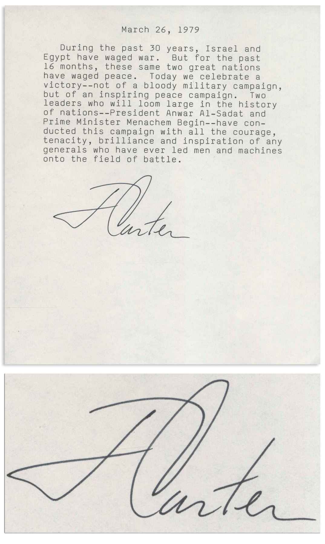Jimmy Carter signed souvenir statement commemorating his words from 26 March 1979 when the Egypt-Israel Peace Treaty was signed. Statement reads in part, ''During the past 30 years, Israel and Egypt have waged war...Today we celebrate a victory--not of a bloody military campaign, but of an inspiring peace campaign...President Anwar Al-Sadat and Prime Minister Menachem Begin--have conducted this campaign with all the courage, tenacity, brilliance and inspiration of any generals who have ever led men and machines onto the field of battle. [signed] J Carter''. Page measures 5.75'' x 6.375''. Near fine condition.