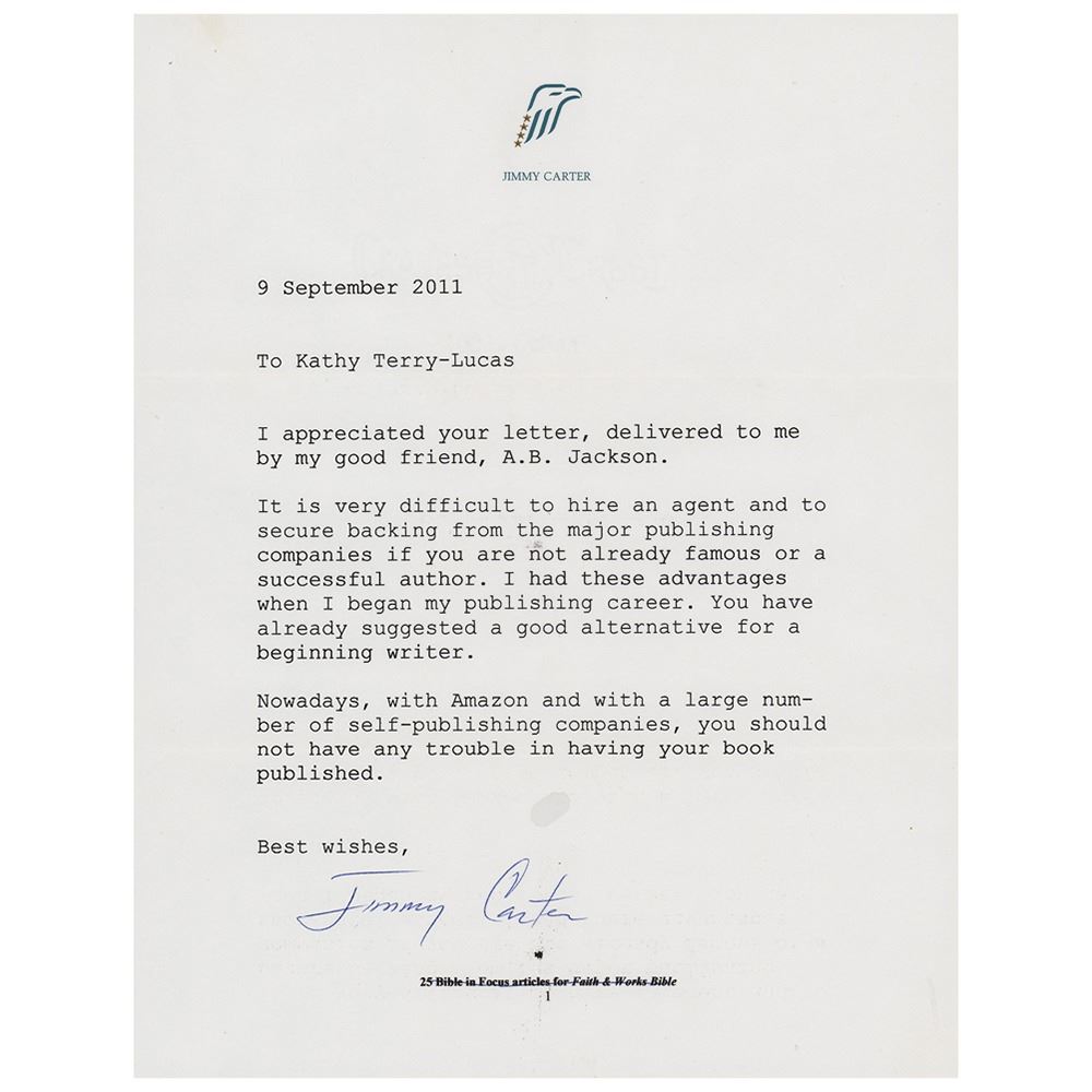 TLS, one page, 8.5 x 11, personal letterhead, September 9, 2011. Letter to Kathy Terry-Lucas, in part: "It is very difficult to hire an agent and to secure backing from the major publishing companies if you are not already famous or a successful author. I had these advantages when I began my publishing career. You have already suggested a good alternative for a beginning writer. Nowadays, with Amazon and with a large number of self-publishing companies, you should not have any trouble in having your book published." In fine condition. Accompanied by the original mailing envelope.