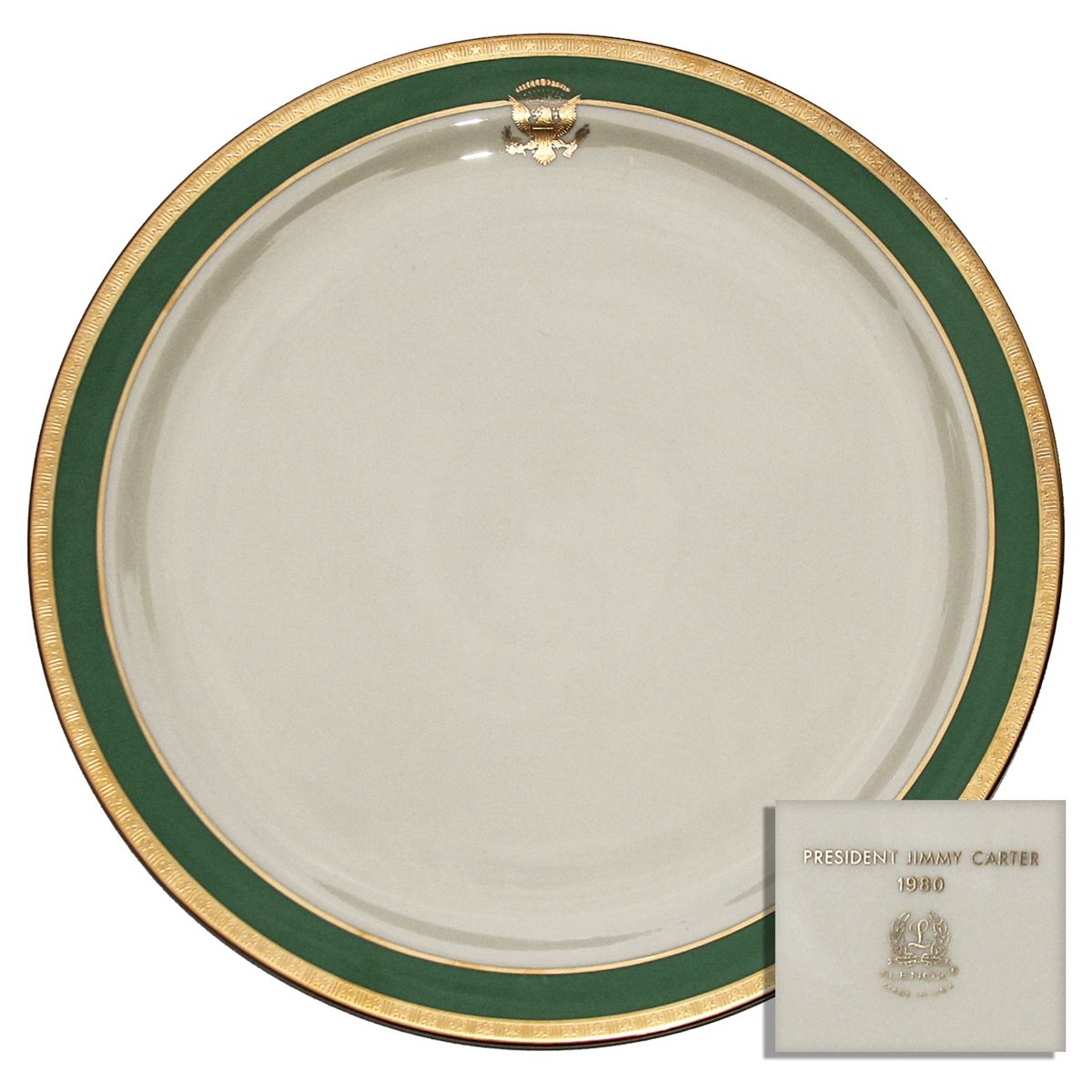 Jimmy Carter White House china. Serving plate is part of the official service commissioned for use at State dinners hosted by the President. The Carter pattern is ivory china with an emerald border and gilt rim embossed with a row of stars and another gilt band. A gilt presidential seal straddles the border at twelve o'clock. Plate by Lenox is stamped in gilt to verso, ''President Jimmy Carter / 1980 / Lenox / Made in USA''. Measures 12.75'' in diameter. A felt tip notation is written to verso of the otherwise immaculate plate. Near fine.