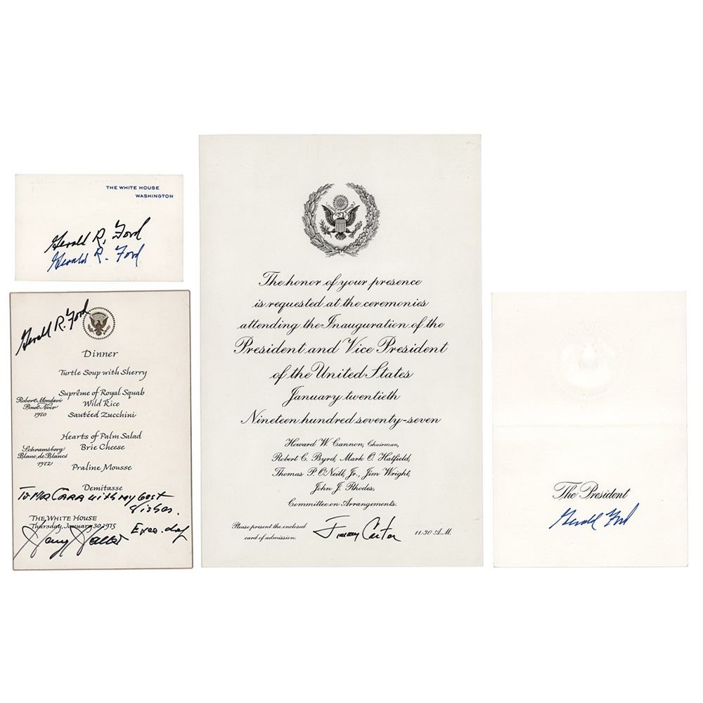 Four items signed by presidents, including one signed by Jimmy Carter and three signed by Gerald Ford: Congressional invitation to the presidential inauguration of 1977, signed in full at the bottom in black felt tip by Jimmy Carter; an official menu for a White House dinner on January 30, 1975, signed in black felt tip by Gerald R. Ford and inscribed by one other; a White House card featuring Ford's facsimile signature, authentically signed below in blue felt tip; and a rare presidential card blindstamped with the Presidential Coat of Arms, signed inside in blue felt tip by Ford. In fine condition.