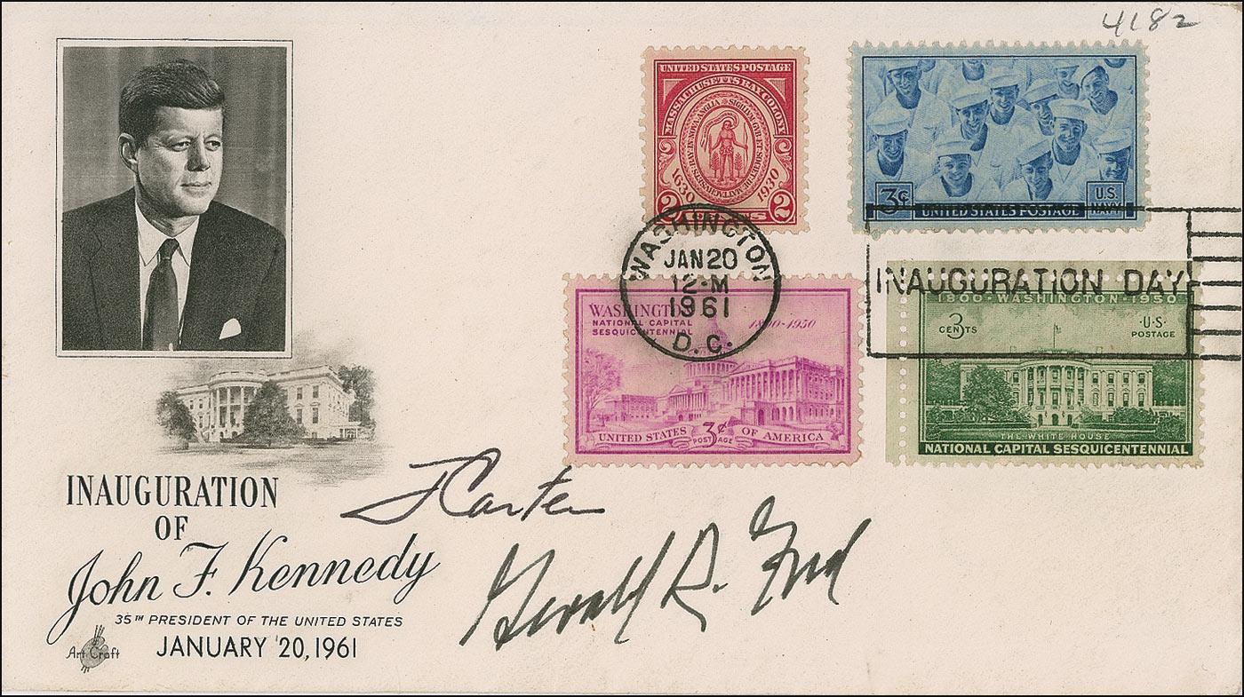 Inauguration Day cover with a cachet honoring John F. Kennedy on his swearing-in as president, signed on the front in black felt tip, “J. Carter” and “Gerald R. Ford.” In fine condition, with a pencil notation on the reverse. Inauguration Day covers are produced only once every four years, making them scarcer than FDCs. RRAuction COA.