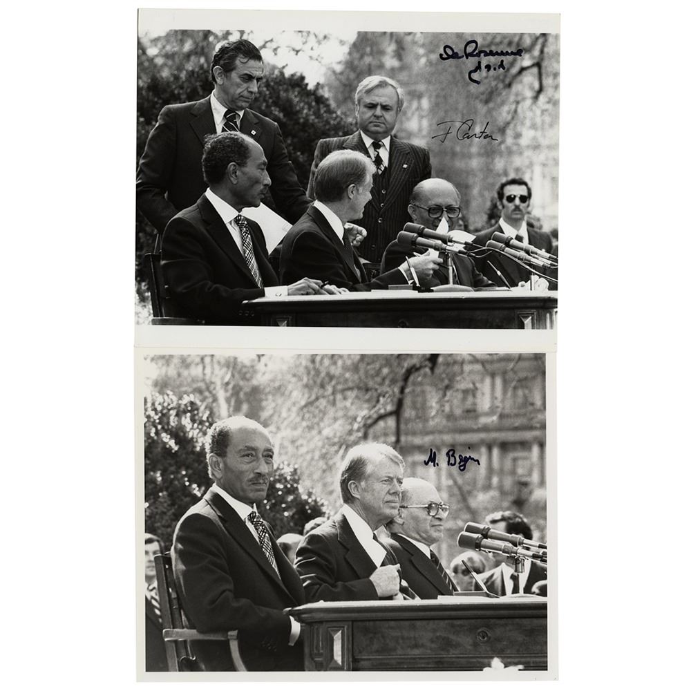 Two glossy 10 x 8 photos of the signing of the Israeli-Egyptian Peace Treaty, one signed in black felt tip by Menachem Begin, and the other signed in black felt tip by Jimmy Carter and Meir Rosenne. In overall fine condition, with a couple light creases to the Begin photo.
