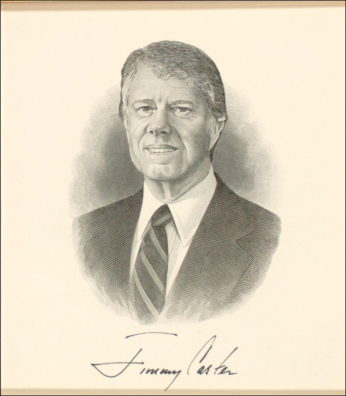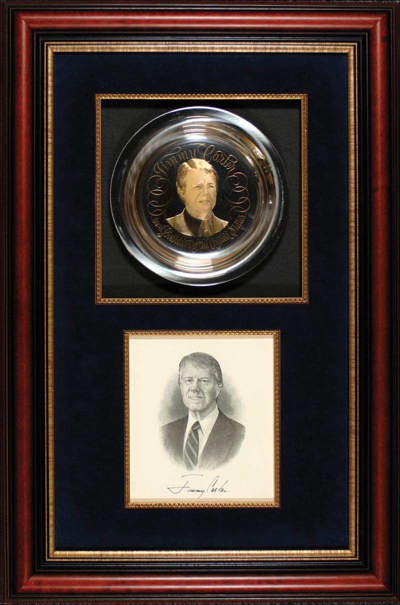 Engraved portrait, 6.25 x 7.25, by the US Bureau of Engraving and Printing, boldly signed in black felt tip below the image, “Jimmy Carter.” Archivally shadow box framed with a gold-inlaid, sterling silver portrait plate issued in a limited edition by the Franklin Mint in the early-to-mid 1970s to an overall size of 18 x 27. In fine condition. Oversized.
