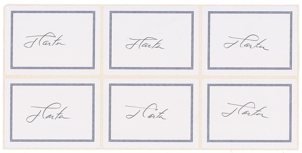 Full sheet of six blue-bordered bookplates, each 4 x 3, each signed in black ink, “J. Carter,” on a 12.75 x 6.25 off-white sheet. In very fine condition.