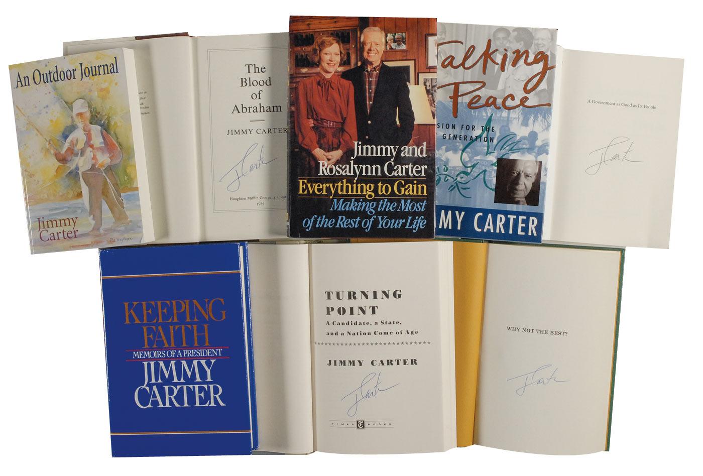Eight items: six signed hardcover books and two softcover books, each signed on an opening page “J. Carter.” Titles are: Why Not the Best (Presidential Edition), The Blood of Abraham, Everything to Gain (also signed by Rosalynn Carter), Turning Point, Talking Peace, Keeping Faith, A Government as Good as Its People, and An Outdoor Journal. In overall very good to fine condition, with light wear to dustjackets. Oversized.