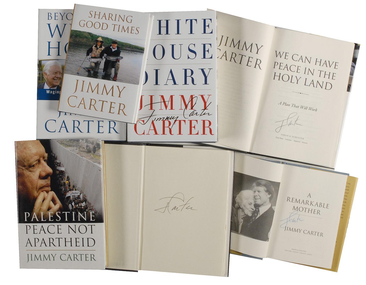 Seven signed hardcover books, each signed on an opening page “J. Carter.” Titles are: Sharing Good Times, Our Endangered Values, Palestine Peace: Not Apartheid, Beyond the White House, A Remarkable Mother, We Can Have Peace in the White House, and White House Diary. In overall fine condition, with light wear to dustjackets. Oversized.