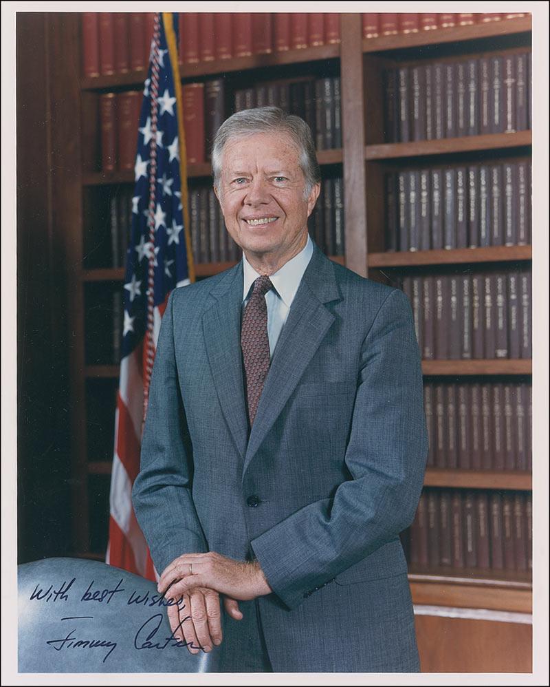 Color satin-finish 8 x 10 photo, signed in black felt tip, “With best wishes, Jimmy Carter.” In fine condition.
