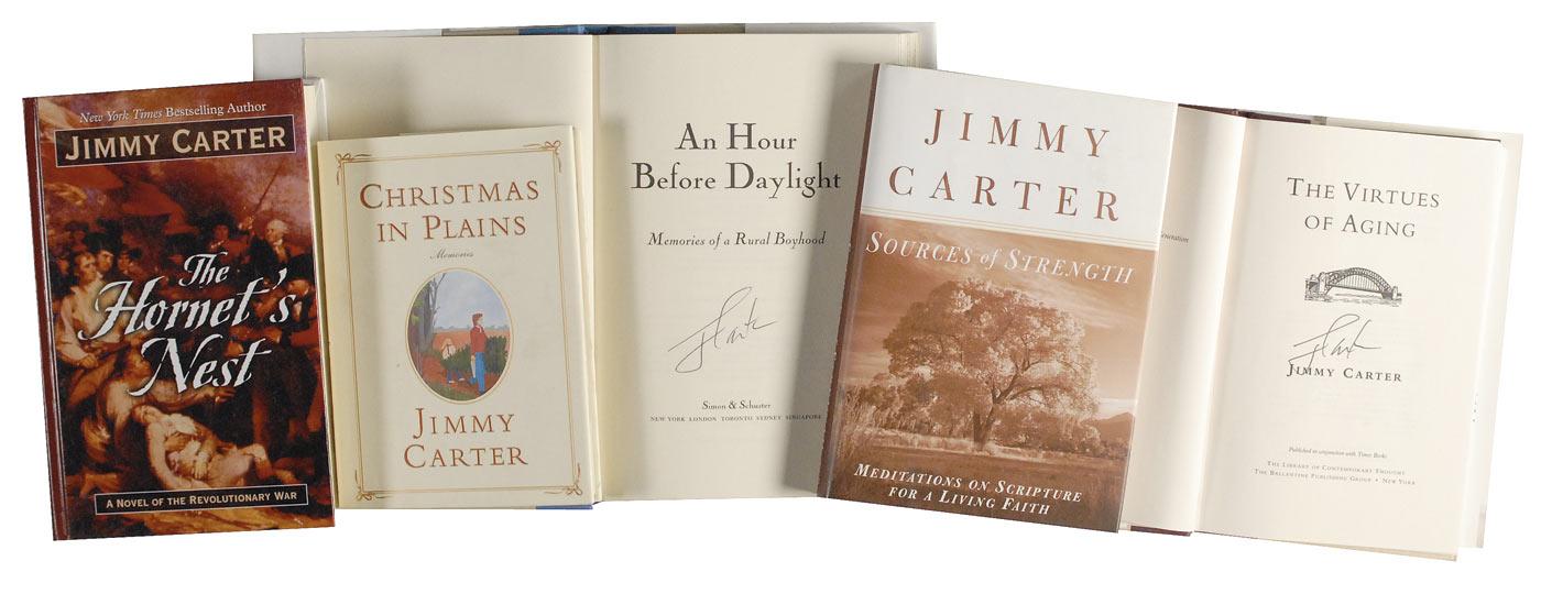 Five hardcover books: Christmas in Plains, The Virtues of Aging, An Hour Before Daylight, Sources of Strength, and The Hornet’s Nest, each signed on an opening page in blue or black ink “J. Carter.” In overall fine condition.