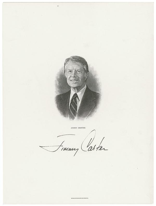 Engraved portrait of Carter, 6 x 8, by the Bureau of Engraving and Printing, signed in black felt tip. In fine condition.