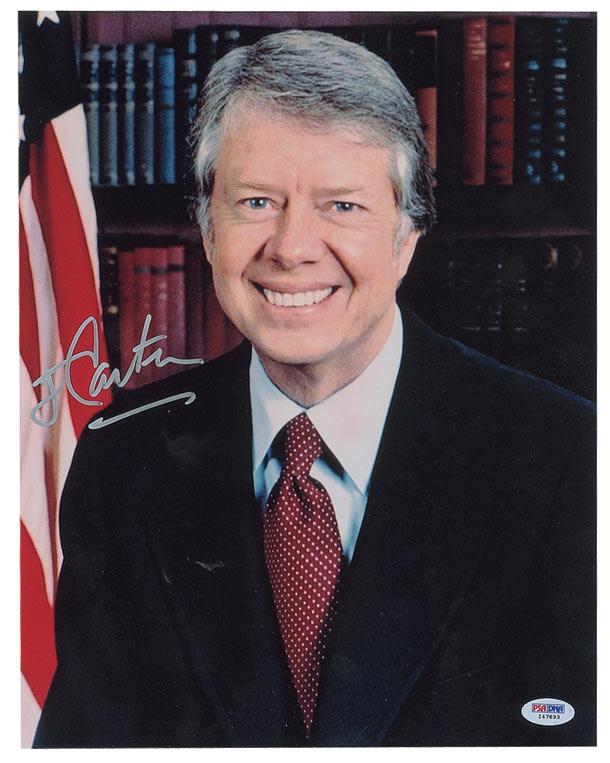 Color satin-finish 11 x 14 photo, signed in silver ink, “J. Carter.” In fine condition, with a couple trivial corner creases and a PSA/DNA authentication label affixed to bottom corner. Accompanied by a certificate of authenticity from PSA/DNA.