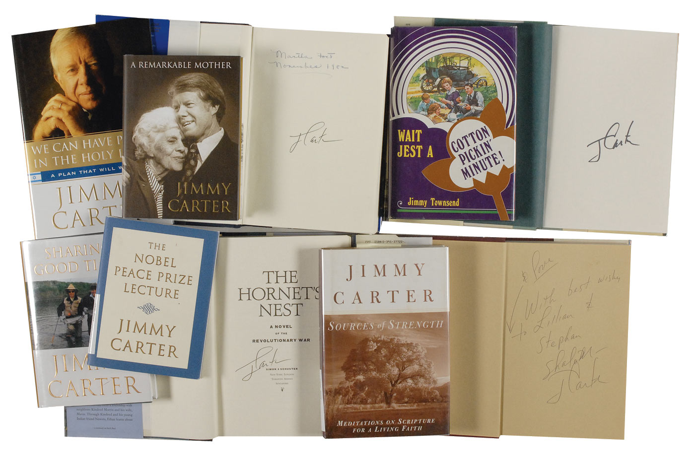 Ten different hardcover books, eight authored by Carter, each signed on an opening page in ink or felt tip, “J. Carter,” with one signature on a bookplate, and Carter adding an inscription to another. In fine overall condition, with expected wear. Oversized.