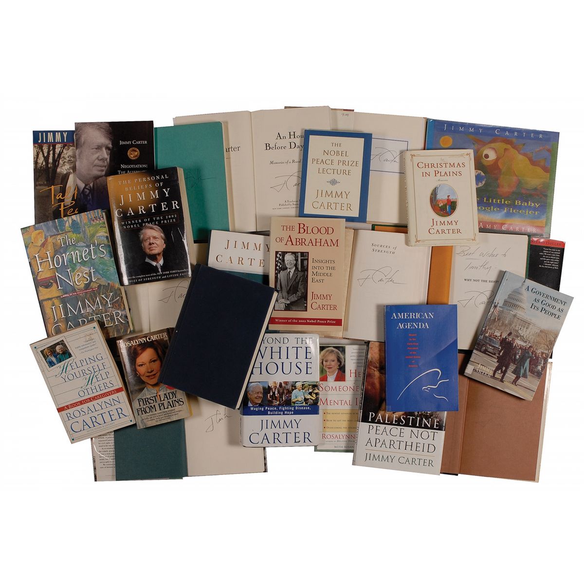 Twenty-five different books (17 hardcover), each signed “J. Carter” in ink or felt tip on an opening page, with eight signed on a bookplate, and one inscribed. In fine condition, with light wear to some covers, and some light, scattered soiling and foxing to some pages and the text blocks. Accompanied by three co-authored and signed in black felt tip by Rosalynn Carter.