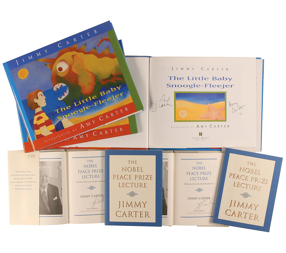 Seven hardcover books with dustjackets: four copies of The Nobel Peace Prize Lecture, each signed on the title back in black ballpoint, “J. Carter”; and three copies of The Little Baby Snoogle-Fleejer, each signed on the title page in black felt tip by Carter, “J. Carter,” and his daughter, “Amy Carter.” In overall very fine condition.