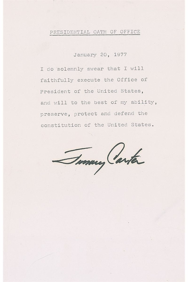 Souvenir typescript of the Oath of Office, 5.75 x 7.5, signed at the bottom in black felt tip, “Jimmy Carter.” In full, “I do solemnly swear that I will faithfully execute the Office of President of the United States, and will, to the best of my ability, preserve, protect and defend the Constitution of the United States.” In fine condition, with some light haloing to signature.
