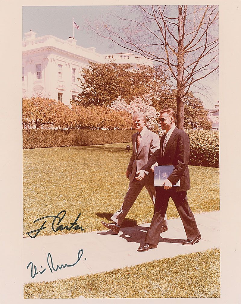 Color satin-finish 8 x 10 White House photo of Carter and Zbigniew Brzezinski walking outside the White House, signed in black felt tip, “J. Carter,” and also signed in black felt tip by Brzezinski. In fine condition.