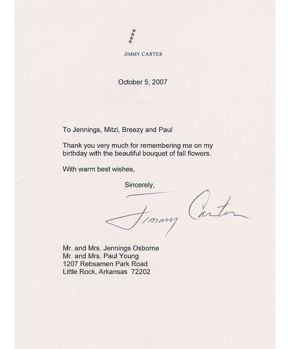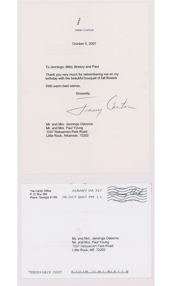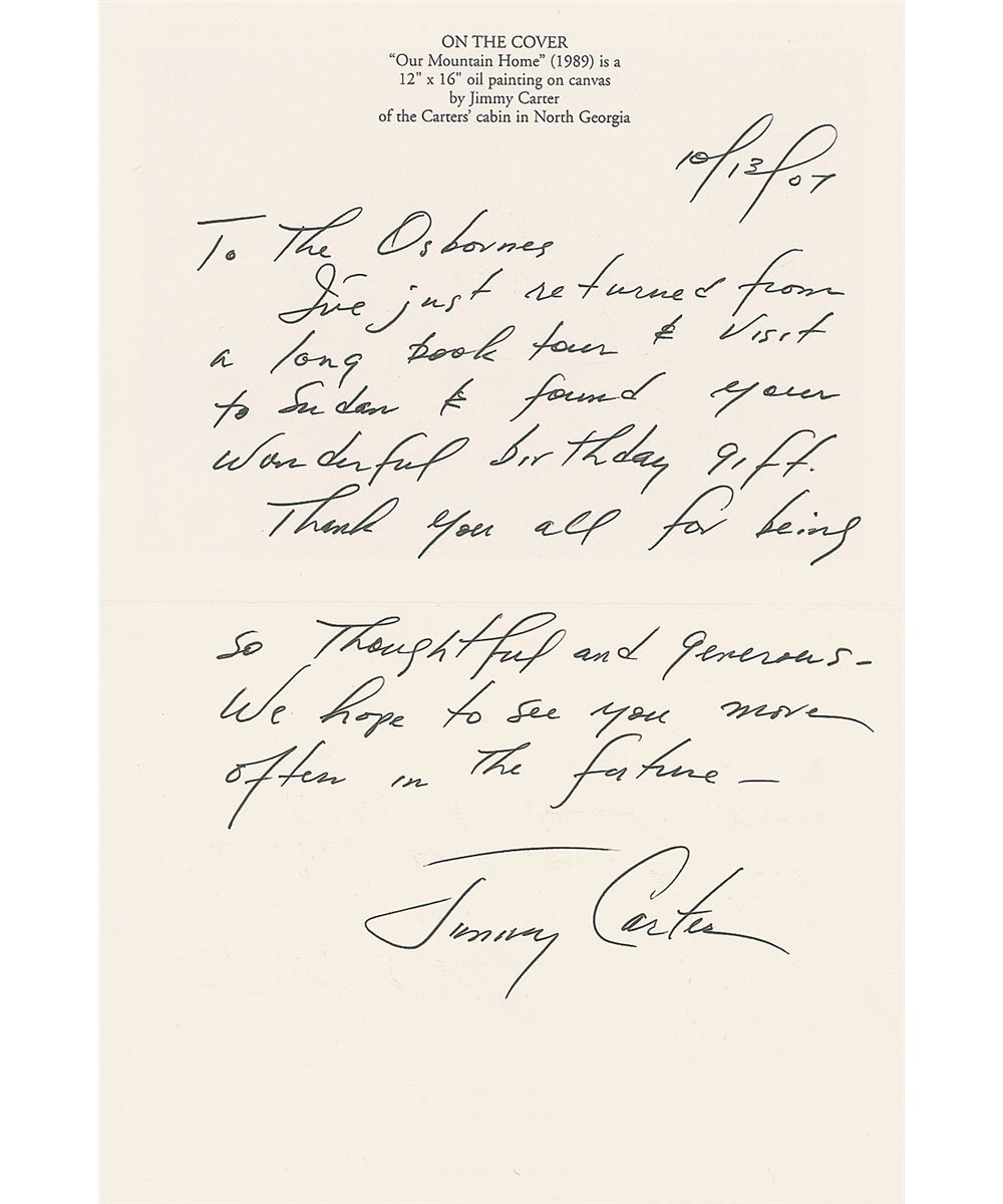 Two letters: a scarce ALS, one page, on the inside of a 6.75 x 10 note card featuring a work by Carter on the front, dated October 13, 2007. Carter writes to the Osbournes, in part: “I’ve just returned from a long book tour & visit to Sudan & found your wonderful birthday gift. Thank you all for being so thoughtful and generous.” Accompanied by the original mailing envelope; and a brief TLS, one page, 6.25 x 8.75, dated October 5, 2007, sending thanks for a sent gift. Letter and its original mailing envelope are affixed to a 7 x 14.5 sheet of cardstock. In fine condition.
