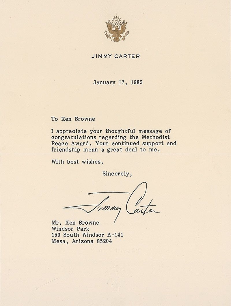 TLS, one page, 6.25 x 8.5, personal letterhead, January 17, 1985. Letter of thanks to Ken Browne. In full: “I appreciate your thoughtful message of congratulations regarding the Methodist Peace Award. Your continued support and friendship mean a great deal to me.” In fine condition.