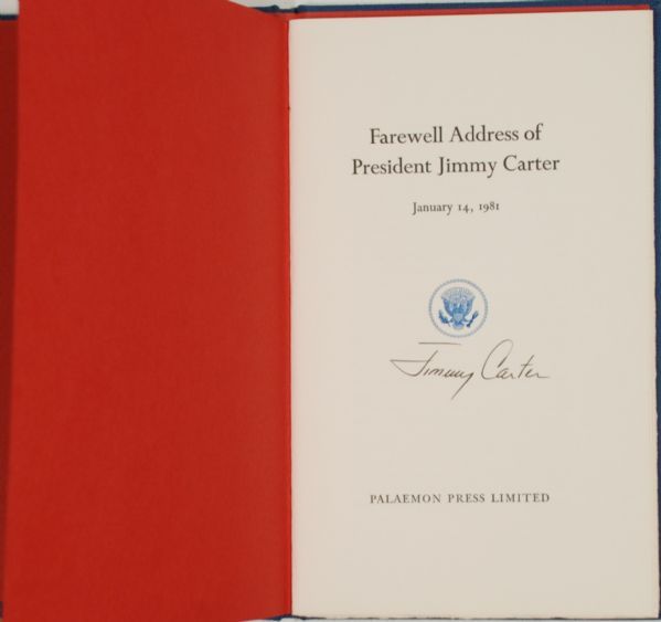 Jimmy Carter: “Farewell Address of President Jimmy Carter January 14, 1981”, bold full signature on the title page. Limited edition. This is #70 of 300 copies. With slipcase, the top inch of which has some fading.