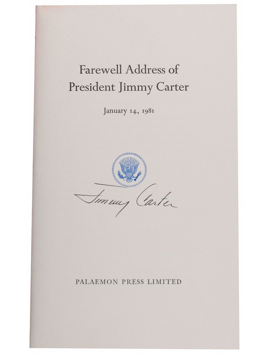 Signed book: Farewell Address of President Jimmy Carter. First edition, limited issue, numbered 60/300. Winston-Salem, NC: Palaemon Press Limited, 1981. Hardcover with slipcase, 6.5 x 10.75, 9 loosely-stitched pages. Signed on the half-title page in black ink, “Jimmy Carter.” In fine condition, with some slight fading to the spine and slipcase.
